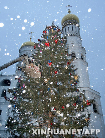 12月24日,在俄羅斯首都莫斯科的克里姆林宮,工人冒雪布置圣誕樹(shù)。新華社/法新