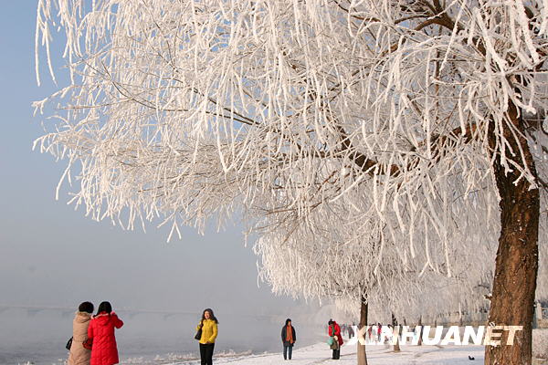 12月28日,游客在松花江畔觀賞霧凇美景并拍照留影。伴隨著我國北方大范圍降溫,吉林省吉林市松花江兩岸近日出現(xiàn)大面積霧凇美景,十里長堤銀裝素裹,分外妖嬈,令慕名而來的各地游客大飽眼福。