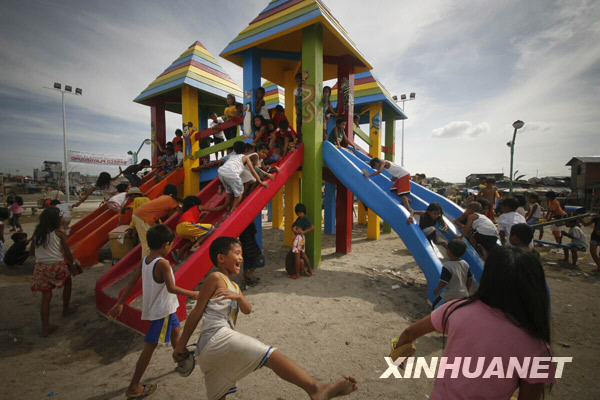 12月26日,在菲律賓首都馬尼拉的一個貧民窟,孩子們在剛設(shè)立的兒童游樂場內(nèi)嬉戲。