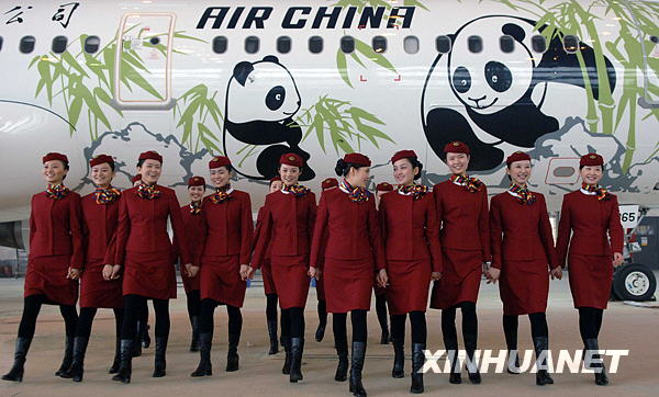 12月25日,國航西南分公司的空乘人員迎接“秀美四川”號彩繪飛機(jī)出廠。當(dāng)日,以水墨畫風(fēng)格噴涂大熊貓母子親密形象的第二架“秀美四川”號彩繪飛機(jī)在成都亮相。據(jù)悉,國航將使用兩架嶄新的“秀美四川”號A321彩繪飛機(jī)來執(zhí)行成都至臺北航線。