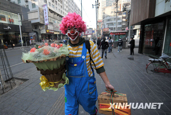 2008年12月30日,前去給顧客投遞物品的“小丑投遞員”王金走在大街上。