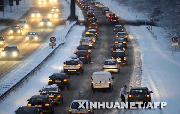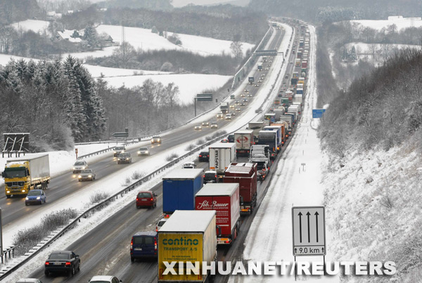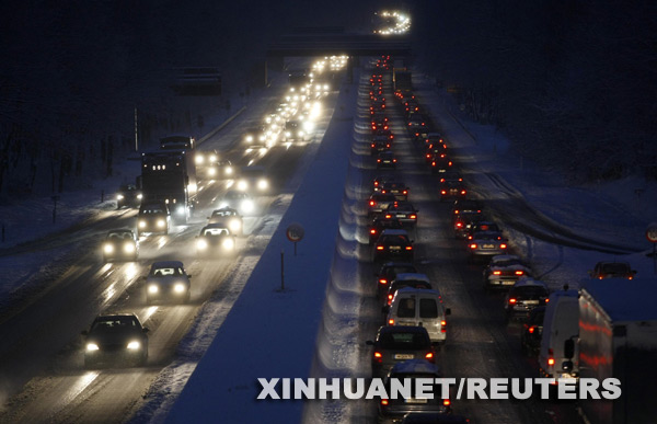 1月5日,在德國波鴻,車輛在公路上緩慢行駛。 當日,德國多數地區(qū)降下大雪,積雪厚達20厘米。大雪導致地面交通癱瘓,有些地方車輛排隊長達30公里。勃蘭登堡州一夜之間發(fā)生100余起交通事故,造成一人死亡多人受傷。新華社/路透
