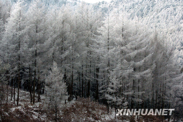 1月5日,在甘肅省隴南市文縣的高樓山上,雪后的山坡上松林銀裝素裹,景色迷人。