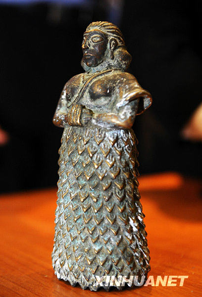 這是1月11日拍攝的埃及歸還給伊拉克的一尊兩河文明時(shí)期的銅像。當(dāng)日,埃及最高文物委員會(huì)主席哈瓦斯代表埃及將一尊兩河流域文明時(shí)期的婦女銅像歸還給伊拉克政府。2005年,一名埃及人試圖將這尊銅像走私進(jìn)入埃及時(shí)被埃及海關(guān)查獲。經(jīng)埃及文物部門(mén)的考證和鑒定,銅像創(chuàng)作于兩河流域文明時(shí)期,描繪的是一名正在祈禱的婦女。