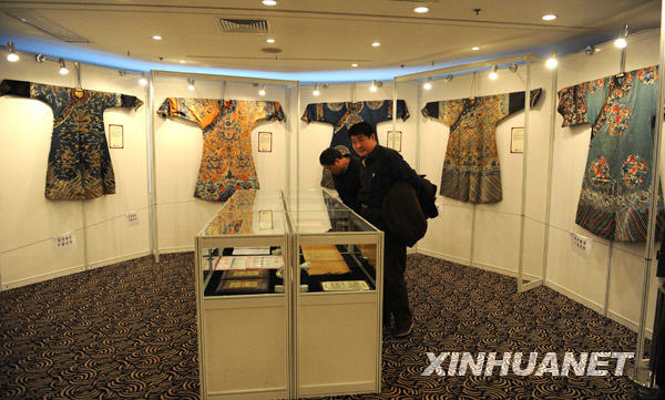 1月14日,來賓在預展上觀賞拍品。當日,北京北緯四十度大成國際拍賣公司(北緯拍賣)在北京舉行新聞發(fā)布會暨拍品預展,宣布包括30件清宮龍袍在內(nèi)的40件珍貴宮廷藝術(shù)精品將在1月16日舉行的北緯首拍會上進行拍賣。
