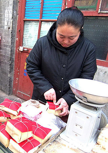1月13日,在北京前門大柵欄西街,一位制售老北京香酥糕的個(gè)體戶,在為顧客包裝香酥糕。墊上喜慶的紅紙,用紙繩系緊,這種既環(huán)保又懷舊的包裝形式吸引了不少顧客。