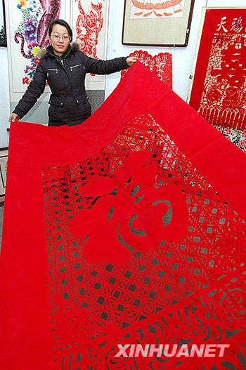 1月18日,山東淄博周村的剪紙藝人劉敏燕展示巨幅剪紙。新春佳節(jié)臨近,淄博市周村古城剪紙藝人劉敏燕制作的傳統(tǒng)民俗圖案剪紙受到顧客歡迎。