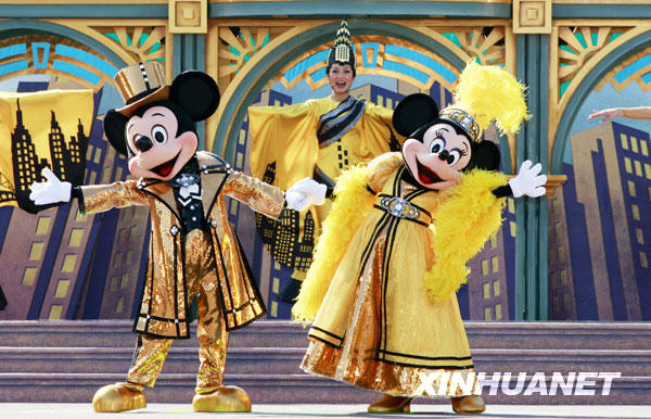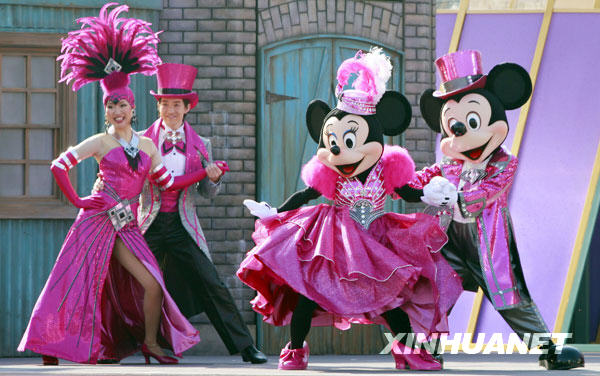 1月19日,在日本東京附近的迪斯尼樂園,米奇和米妮穿上嶄新的服裝在舞臺(tái)上表演。