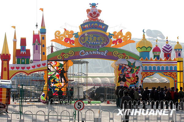 1月19日,工人們在位于國家體育場“鳥巢”東北側(cè)的嘉年華主題公園內(nèi)施工。目前,北京奧運中心區(qū)內(nèi)正在加緊建設(shè)嘉年華主題公園,該項目占地約4萬平方米,將于春節(jié)前后向市民開放。