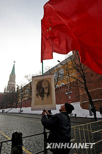 1月21日,在俄羅斯首都莫斯科紅場(chǎng)附近,一名俄共老黨員高舉掛有列寧像的紅旗。當(dāng)日,數(shù)百名俄共黨員及普通民眾舉行活動(dòng),紀(jì)念列寧逝世85周年。1921年1月21日,無(wú)產(chǎn)階級(jí)革命的偉大導(dǎo)師列寧在莫斯科附近的哥爾克村逝世,享年54歲。