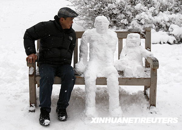 2月2日,在英國首都倫敦的一個公園里,一名男子坐在堆有雪人的長椅上。當日,大雪造成倫敦市所有公共汽車和部分火車停運,機場也被迫關閉。新華社/路透