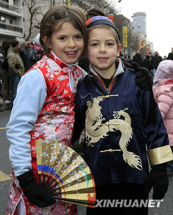 2月1日,兩名兒童身著中國傳統(tǒng)服裝在法國巴黎13區(qū)“中國城”參加迎新春游行。當(dāng)天,法國巴黎13區(qū)“中國城”舉行一年一度的迎新春大游行,吸引了眾多當(dāng)?shù)孛癖娗皝碛^賞。