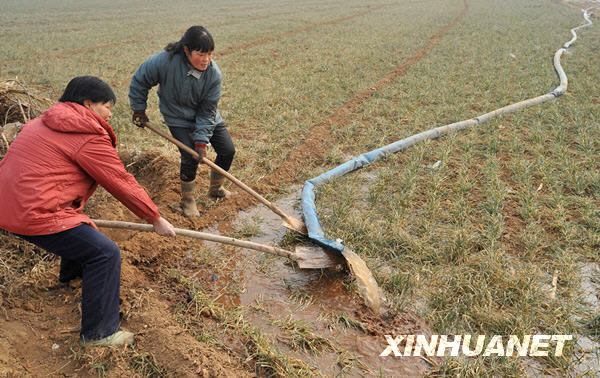 2月4日,村民引來洛河水灌溉農田。由于2008年10月以來一直缺少有效降水,河南大部分地區(qū)出現(xiàn)不同程度的旱情。其中僅洛陽市高新區(qū)辛店鎮(zhèn)辛店村小麥受旱面積就達1000多畝,目前全村正動員干部群眾進行農田灌溉,現(xiàn)已有三分之一的受旱農田完成灌溉。