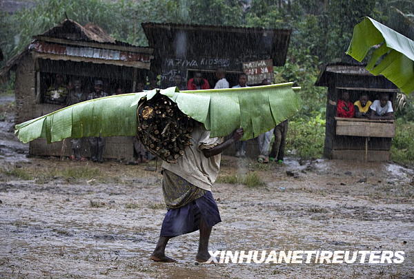 2月4日,在剛果(金)東部的卡倫蓋村,一名婦女用一片香蕉葉避雨。新華社/路透