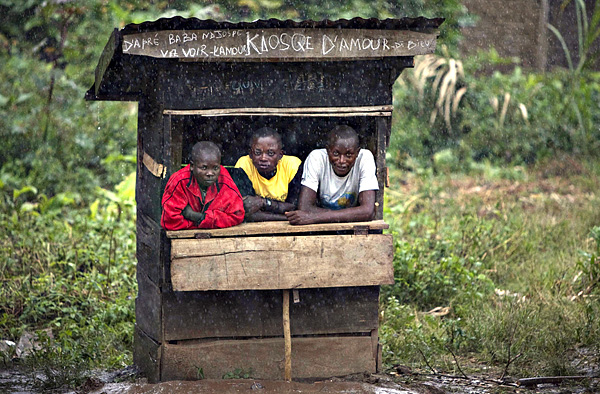2月4日,在剛果(金)東部的卡倫蓋村,幾名男子躲在小屋里避雨。新華社/路透