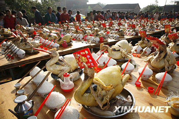 2月8日,廣東湛江廉江市營(yíng)仔鎮(zhèn)云峽村的村民們?cè)谥蠛玫碾u嘴里夾上“紅包”后集中擺放在村中祠堂前的宴席上。 當(dāng)日是農(nóng)歷正月十四,是廣東湛江廉江市營(yíng)仔鎮(zhèn)云峽村的傳統(tǒng)“年例”,當(dāng)?shù)乩习傩找懒?xí)俗殺雞設(shè)宴,祭祀社稷,祈禱風(fēng)調(diào)雨順,五谷豐登。