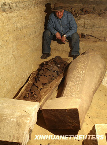 這張由埃及最高文物委員會(huì)2月9日公布的照片顯示,該委員會(huì)主席扎!す咚棺谝痪咝鲁鐾恋哪灸艘僚浴P氯A社/路透埃及考古學(xué)家當(dāng)天表示,他們?cè)谑锥奸_羅以南塞加拉地區(qū)一座有2600多年歷史的墳?zāi)怪邪l(fā)現(xiàn)了20多具木乃伊。該墳?zāi)箍勺匪葜凉?40年,正值第26王朝時(shí)期。新華社/法新