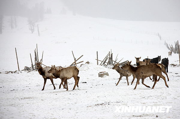 2月11日,幾只馬鹿在雪中覓食。當日,新疆哈密北部沿天山一帶普降小到中雪,這場春雪有效緩解了巴里坤草原的旱情,對草場返青十分有利。