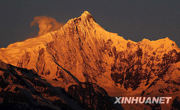 這是2月16日拍攝的梅里雪山“日照金山”奇觀。梅里雪山主峰卡瓦格博在太陽光的照射下如同一座金山般光芒萬丈。