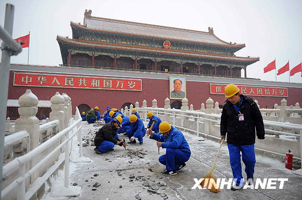 2月18日,工人在天安門金水橋上施工。 為迎接新中國成立60周年,天安門管委會從當日起對金水橋實施保護修繕,工程擬于2009年5月1日前完工,并整體對外開放 經專家鑒定,金水橋主要存在石質文物風化、橋欄板欄桿局部開裂、橋面石材磨損等問題,亟待保護維修。據悉,此次修繕工作將分階段進行,由于施工圍擋防火板高度有限,因此金水橋和天安門城樓的整體景觀和游覽不會受到太大影響。