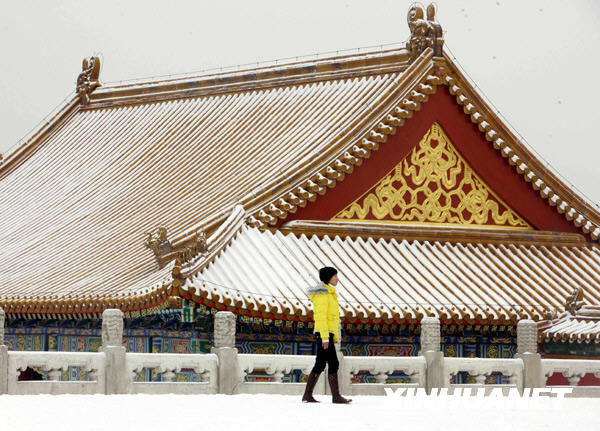 2月19日,北京故宮博物院的一位清潔工在工作間隙拍攝雪景。經(jīng)過連續(xù)3日的降雪,北京故宮銀裝素裹,別有一番韻味。