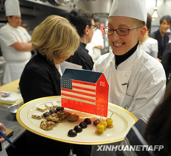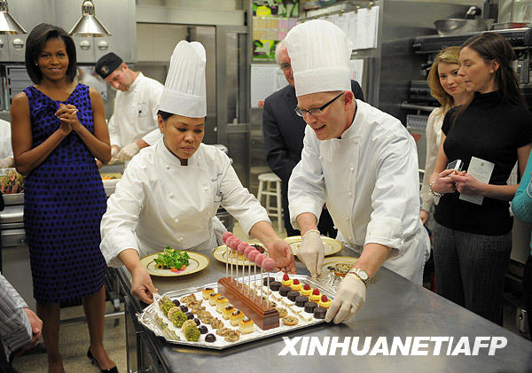 2月22日,在美國華盛頓白宮的廚房里,美國“第一夫人”米歇爾·奧巴馬(左)探望為宴請州長的晚餐而忙碌的廚師們。新華社/法新