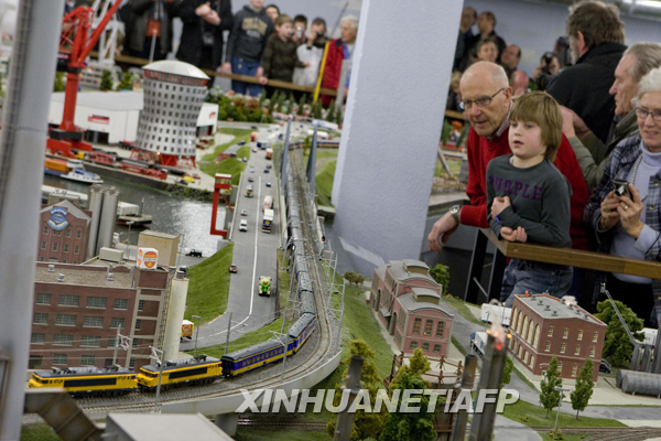 2月19日,在荷蘭城市鹿特丹,人們觀看一輛微縮玩具火車。這輛小火車約16米長,重12公斤,有3個火車頭。它有望打破“世界上最長微縮客運列車”的紀錄。新華社/法新