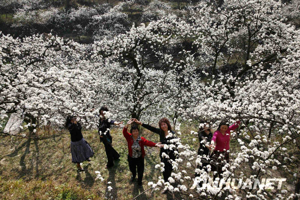 貴定縣盤江鎮(zhèn)中落海村的萬(wàn)畝李樹(shù)鮮花盛開(kāi),游人在樹(shù)林間翩翩起舞(2月24日攝)。