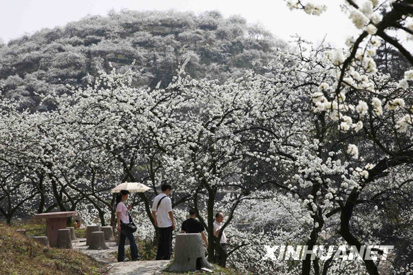 貴定縣盤江鎮(zhèn)中落海村的萬(wàn)畝李樹(shù)鮮花盛開(kāi),游人漫步林間賞花(2月24日攝)。 | |