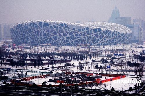2009年2月19日,“鳥巢”迎來第二場(chǎng)牛年春雪。 中新社發(fā) 李吉 攝