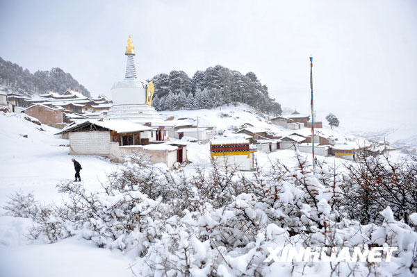 連日來,甘肅省甘南藏族自治州大部分地區(qū)普降大雪,這場(chǎng)降雪有效緩解了甘南草原的旱情。甘南州碌曲縣境內(nèi)著名的旅游勝地郎木寺在大雪中景色更顯奇異。