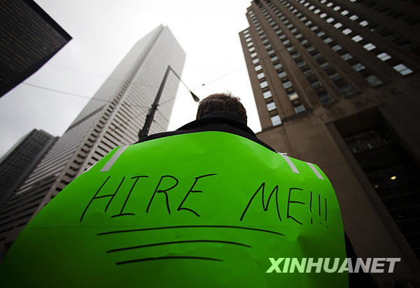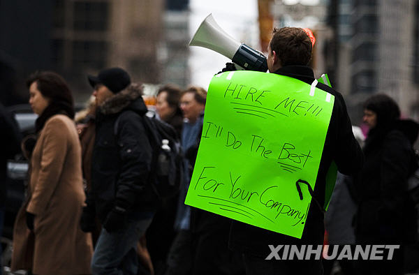 3月5日,在加拿大多倫多街頭,一名男子身披寫有“雇用我吧!”字樣和個(gè)人簡歷的紙衣,在街頭使用擴(kuò)音器找工作。據(jù)加拿大統(tǒng)計(jì)局公布的數(shù)據(jù),今年1月,加拿大新增失業(yè)人數(shù)達(dá)到12.9萬人,創(chuàng)30年來月最高紀(jì)錄,失業(yè)率由2008年12月的6.6%升至7.2%。新華社/路透 |