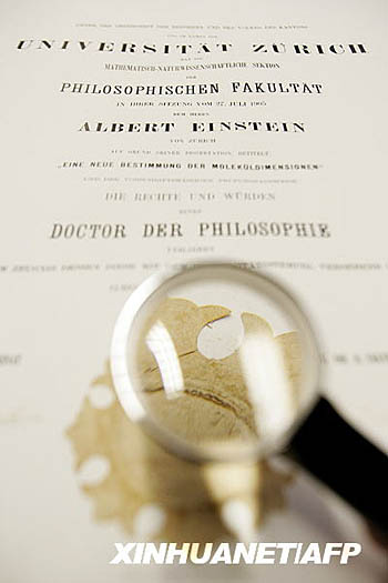 3月8日,在瑞士盧塞恩的菲舍爾畫(huà)廊,一名工作人員拿放大鏡觀看愛(ài)因斯坦的博士學(xué)位證書(shū)。瑞士菲舍爾畫(huà)廊3月6日宣布,將在6月份拍賣(mài)著名理論物理學(xué)家、相對(duì)論創(chuàng)始人阿爾伯特·愛(ài)因斯坦1906年在蘇黎世大學(xué)獲得的博士學(xué)位證書(shū)。新華社/法新
