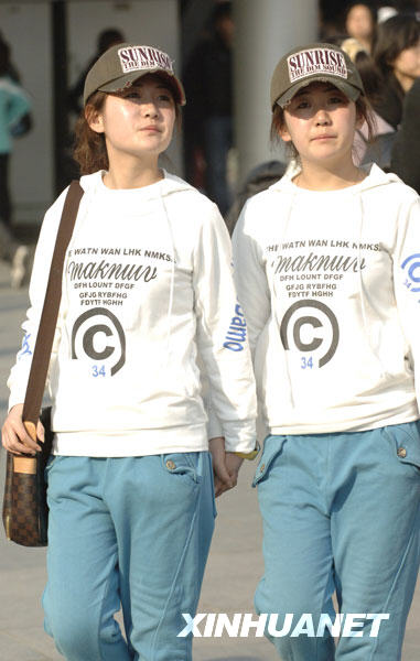 3月8日,北京一對著裝輕便的雙胞胎姐妹在逛街。當(dāng)日,北京天氣晴朗,最高氣溫14攝氏度,讓人感受到濃濃的春意。