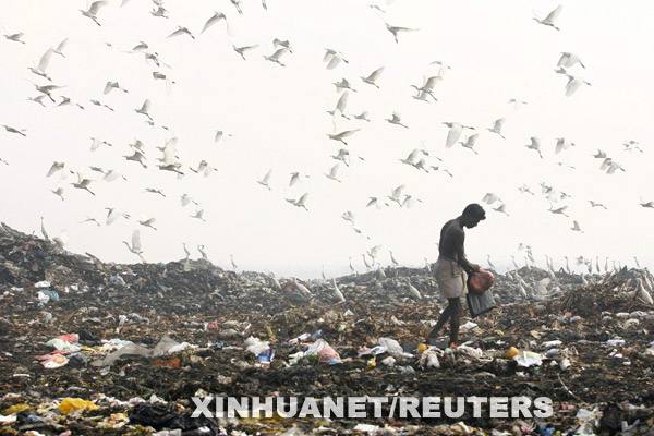 3月7日,一名男子在斯里蘭卡首都科倫坡郊外的一個垃圾場里揀拾有用的物品。新華社/路透
