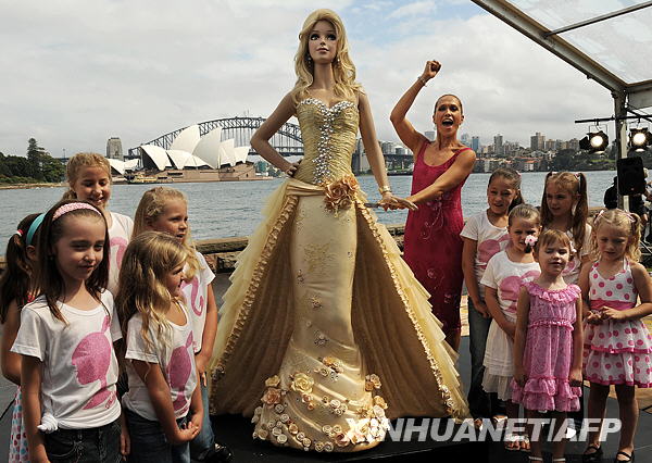 3月9日,在澳大利亞悉尼,模特埃麗卡·海娜茨準(zhǔn)備切下高達(dá)2.1米的“芭比娃娃”巧克力蛋糕,以慶祝芭比娃娃50歲生日。當(dāng)日,玩具芭比娃娃迎來50歲生日。芭比娃娃是美國人——美泰玩具公司創(chuàng)辦人露絲·漢德勒于1959年設(shè)計(jì)創(chuàng)造的,以其女兒芭芭拉的昵稱命名。新華社/法新