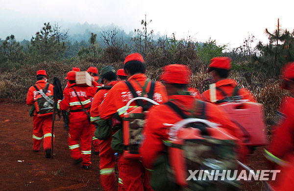 3月11日,專業(yè)撲火隊(duì)員正在前往火場開展撲救。