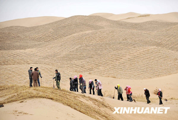 3月12日,寧夏靈武市白芨灘林場職工在毛烏素沙漠邊緣扎草方格。被騰格里、毛烏素、烏蘭布和三大沙漠包圍的寧夏回族自治區(qū)長年干旱少雨,是我國土地沙漠化最嚴重的地區(qū)之一。近年來,自治區(qū)不斷加大治沙力度,在沙漠邊緣大面積扎草方格固沙植樹,在沙塵源頭筑成一道“草長城”。目前全區(qū)已累計治理沙化土地47萬公頃,沙化土地面積由建國初的165萬公頃減少到目前的118.3萬公頃,在全國率先實現(xiàn)荒漠化逆轉(zhuǎn)。