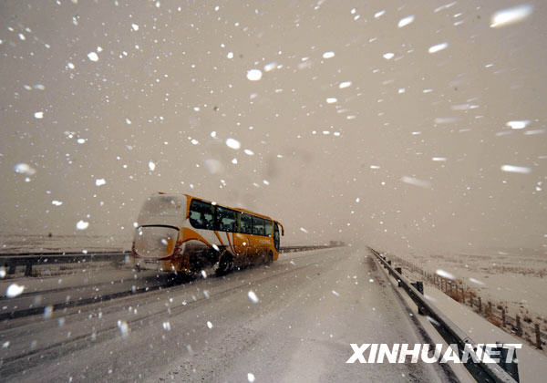 3月12日,一輛客車冒雪行駛在甘肅省張掖市山丹縣境內。從3月11日起,甘肅河西走廊的武威、金昌、張掖等地部分地區(qū)喜降春雪,有利于緩解旱情、春播生產(chǎn)。