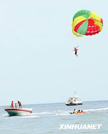 3月22日,一名游客在大東海體驗“飛起來”的感覺。近日,氣溫適宜、陽光燦爛的海南三亞市吸引了眾多中外游客來此享受陽光沙灘、碧海藍天。