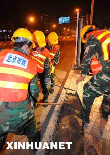 3月20日晚,工人在北京市西長安街南側(cè)施工。當(dāng)晚,北京長安街開始大修,預(yù)計8月30日之前完工,大修期間,長安街白天仍可正常通行。記者從北京市交通委了解到,大修施工時間是每天23時至次日5時,將歷時5個月。伴隨此次道路大修,將同步進(jìn)行交通工程、綠化整治和公交優(yōu)化,對建國門立交橋進(jìn)行橋面翻新和結(jié)構(gòu)加固,對沿線多處地下通道出入口進(jìn)行延長調(diào)整,實(shí)現(xiàn)長安街復(fù)興門至建國門路段五上五下雙向十車道的規(guī)劃,還將對察院胡同到國家大劇院段的南側(cè)主路進(jìn)行展寬。 | |