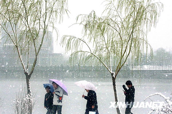 3月24日,山東濱州學(xué)院的幾名學(xué)生冒雪行走在校園里。當(dāng)日,山東部分地區(qū)迎來雨夾雪,個別地區(qū)還出現(xiàn)了中到大雪。專家介紹說,此次降雪有利于改善土壤墑情,但低溫也可能帶來凍害。新華社發(fā)