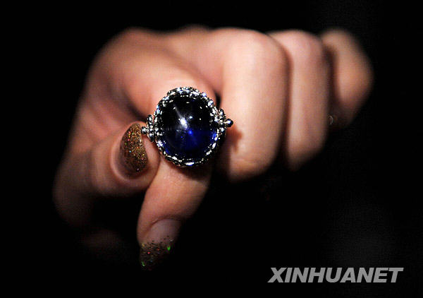 3月26日,模特在展示鑲有32.84克拉天然雙蛋面雙星光緬甸藍(lán)寶石的指環(huán)(估價(jià)達(dá)260萬至330萬港元)。