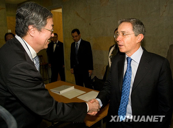3月29日,在哥倫比亞第二大城市麥德林,中國人民銀行行長周小川(左)與哥倫比亞總統(tǒng)烏里韋舉行會談。當(dāng)天,正在麥德林參加美洲開發(fā)銀行年會的周小川與烏里韋舉行會談,就進一步加強合作交換了意見。新華社發(fā)(戴維·德拉巴斯攝)