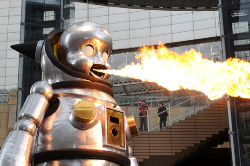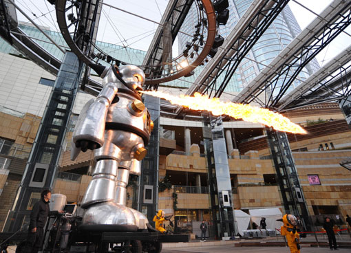 3月27日,日本著名美術(shù)家矢延憲司制作的高7.2米的巨型機(jī)器人“巨人Torayan”出現(xiàn)在東京街頭,他不僅能載歌載舞,還能從嘴部噴射出巨大的火焰,令人們大為吃驚。
