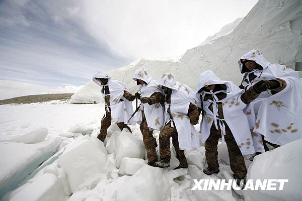 3月22日,官兵們?cè)诤0?546米的幕士塔格峰巡邏途中結(jié)合實(shí)戰(zhàn)訓(xùn)練時(shí)食冰塊解渴。