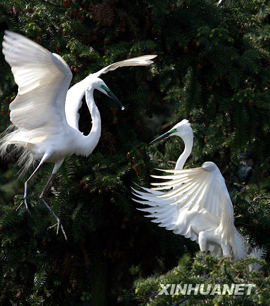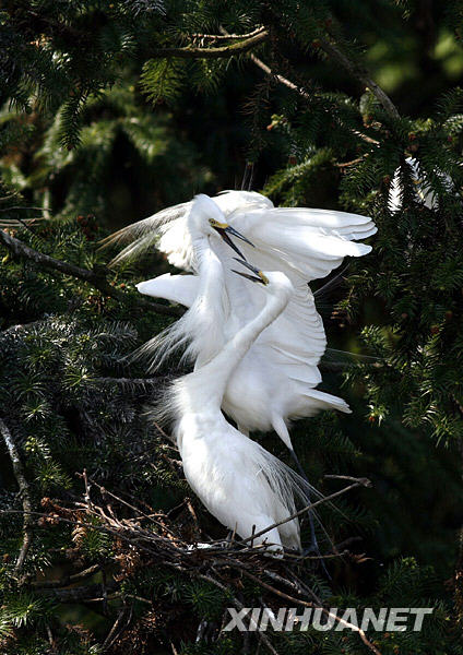 4月6日,一對(duì)白鷺在林中嬉戲。新華社發(fā)(沈俊峰 攝)