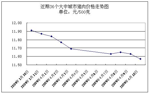 據(jù)國家發(fā)展改革委價(jià)格監(jiān)測中心監(jiān)測,上周(2009.4.7-2009.4.10,下同)36個(gè)大中城市集市、超市豬肉(精瘦肉)平均零售價(jià)格每500克為11.62元,與前一周(2009.3.30-2009.4.3,下同)相比下降1.69%。