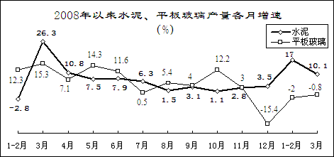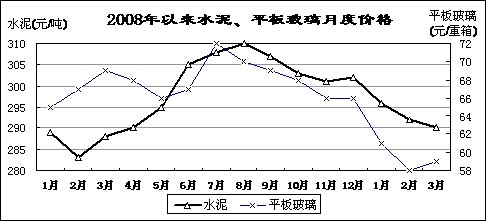 水泥、平板玻璃價格低位波動。3月份,重點建材企業(yè)水泥平均出廠價為290元/噸,比2月份回落2元/噸,降至2008年4月份水平,同比上漲2元/噸;平板玻璃出廠價59元/重量箱,比2月份回升1元/重量箱,同比回落10元/重量箱。3月末,重點建材企業(yè)水泥庫存1226萬噸,同比上升19.1%;平板玻璃庫存2084萬重量箱,下降14.6%。