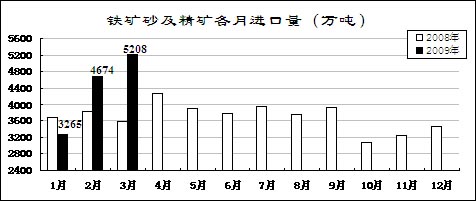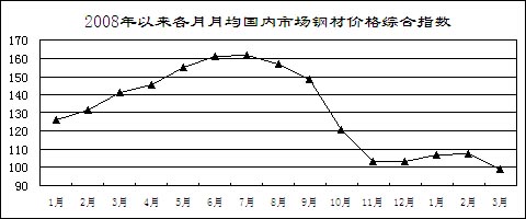 鋼材價(jià)格先升后降。受市場預(yù)期好轉(zhuǎn)和銷售企業(yè)補(bǔ)充庫存影響,鋼材價(jià)格從年初開始小幅回升,2月上旬國內(nèi)市場鋼材價(jià)格綜合指數(shù)為109.26,比去年12月最后一周回升5.96點(diǎn)。但由于有效需求沒有明顯恢復(fù)而生產(chǎn)增長較快,2月中旬開始鋼材價(jià)格持續(xù)大幅回落。3月最后一周,國內(nèi)市場鋼材價(jià)格綜合指數(shù)為97.16,比2月上旬回落12.1點(diǎn),低于去年最低水平4.33點(diǎn)。3月份,6.5mm高線、20mm中厚板平均價(jià)格分別為3368元/噸和3443元/噸,比去年最低的11月份下降6.9%和2.3%,同比下降33.5%和42.3%;1.0mm冷軋板卷4312元/噸,比去年最低的11月份上漲4%,同比下降34.3%。